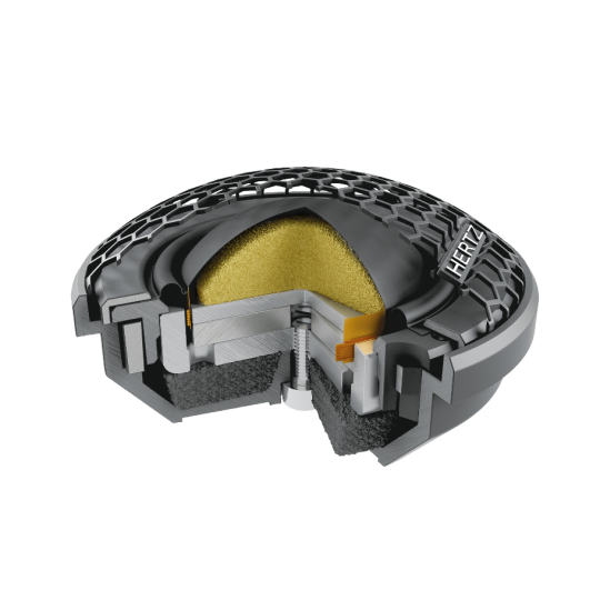 The MP 165P.3 woofer electroacoustic parameters have been forged to give it the pure and solid sound of an authentic mid-bass, designed for high dynamic systems. The voice coil with a generous 14 mm height, has a nominal 3 Ω impedance in addition to an increased power handling. These features provide the ability to maximally exploit the power of the Hertz HCP and HDP amplifiers as well as all the 2 Ω stable electronics. The ferrite 95 mm diameter magnet enables a +/-4.5 mm voice coil linear excursion, ensuring utmost control at all times. The Boundary Free Surround moves a bigger amount of air, and the V-cone® profile improves the offaxis dispersion, the real in-car listening condition. The sophisticated aluminium alloy basket neutralizes the undesired vibrations.