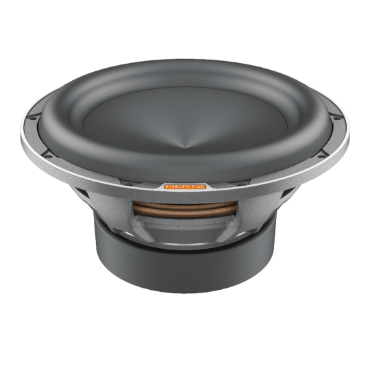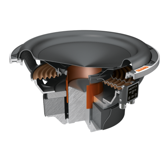 Outstanding performance in a compact size, this is the target of Mille Pro car audio subwoofers. On the strength of its know-how acquired with Mille Legend, the R&D team has optimized the production process to offer the “Hertz Sound Experience” to a wider audience using part of the technologies and materials of the flagship line. The MP 250 D2.3 cone is made by pressing paper pulp with the injection of mineral powders, the same construction technique used for Legend. The V-cone® profile increases rigidity, allowing the cone to function like a piston. Surround materials consist of high-purity IIR-butyl rubber. Like the Legend ML2000.3 and ML2500.3, the Mille PRO subwoofers are built with Boundary Free Surround technology allowing for a greater emission surface with equal diameter, generating higher sound pressure. The compact 6-spoke aluminum alloy anti-resonant basket is the same as the top model ML 2500.3 and contributes to the subwoofer’s mechanical damping, being absolutely transparent to the sound. The 65-mm 4-layer voice coil is higher than 60 mm and wound in a TIL-P former, thus delivering high linear displacement. The 2 Ω + 2 Ω DVC impedance configuration improves versatility to match any amplifier system. The air cooling and decompression system avoids the need for a centre hole on the bottom plate with three advantages: