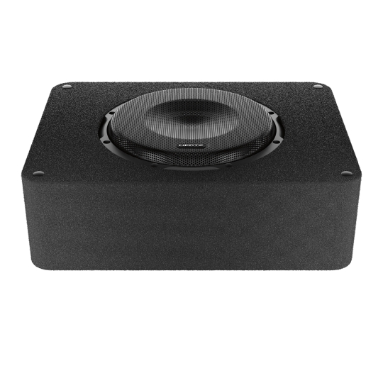 Hertz CBA 250 active subwoofer box, with the 10-inch driver, features a dedicated high-performance amplification module that enhances all the passive box technologies, such as the 2S²(2 Sides / 2 Sounds) design, the Plug & Play terminal block and ultra-compact size. The SSP (Sub Smart Plug) terminal block is provided with a single Plug & Play connector to be able to disconnect the box easily and safely. The amplification module, with power outputs of 250W RMS, is developed with he-li technology (high efficiency / low impedance), which thanks to the absence of the DC-DC voltage booster reach the impressive 90% efficiency level, very close to the theoretical limit of the D-Class. The Butterworth low pass filter at 12dB/Oct. with variable cut-off frequency (50-200 Hz) can be bypassed, when used with an external processor with pre-out output dedicated to the sub. The adjustable bass-boost control (0 ÷ 6 dB) at 45 Hz allows the user to emphasize the response on the lower side of the spectrum and the Phase control (0 - 180°) completes the equipment. The high-level speaker-in input on the multi-pole connector eases the integration with OEM audio systems while the low-level input on RCA is dedicated to the connection with after-market sources.