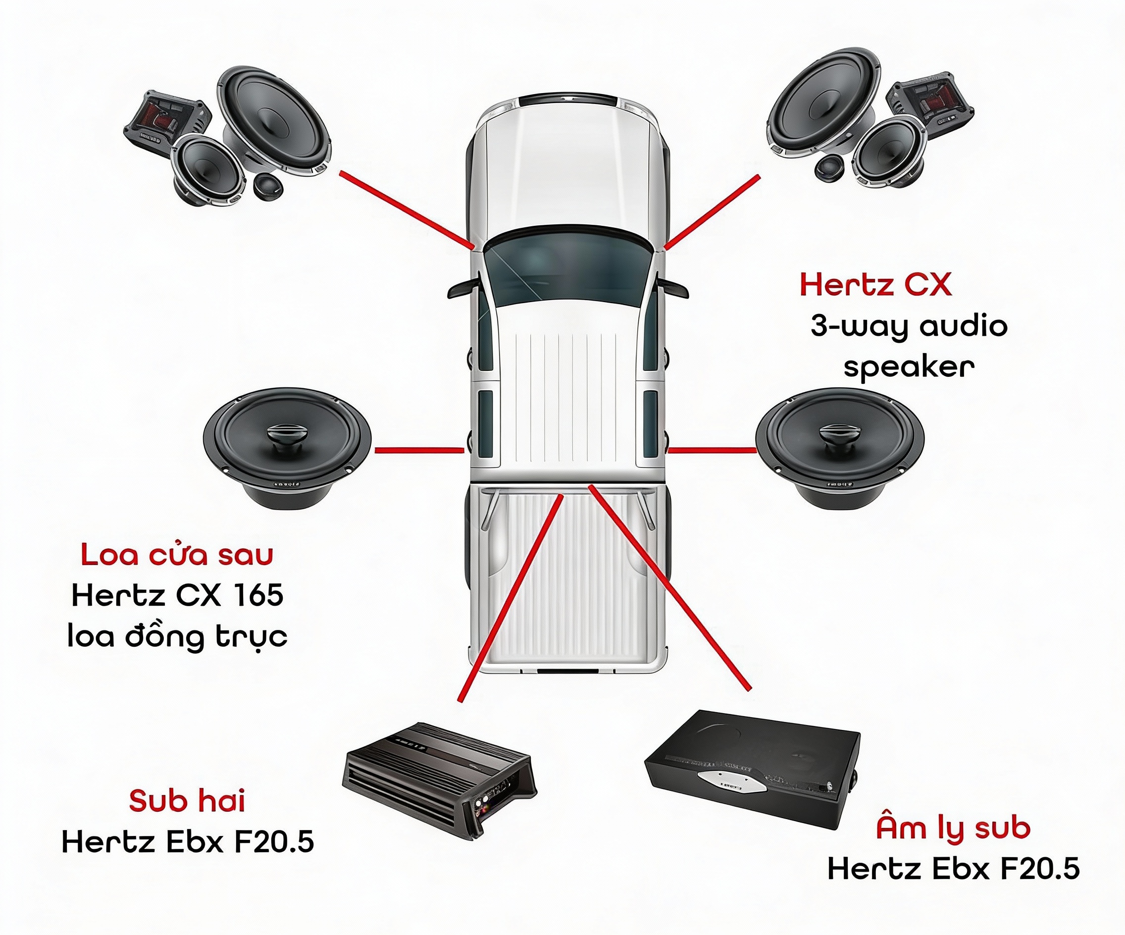 • Hệ thống bổ trợ: Lắp thêm Amply để kéo công suất và DSP (Bộ xử lý tín hiệu số) để cân chỉnh âm thanh.